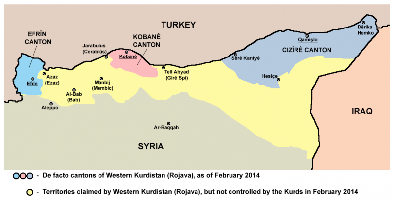 Im Norden des heutigen Syriens, überwiegend kurdisch bewohnte Regionen, an der Grenze der Türkei administrativ gesehen besteht Rojava aus Teilen der syrischen Gouvernements Aleppo, al-Hasaka und ar-Raqqa