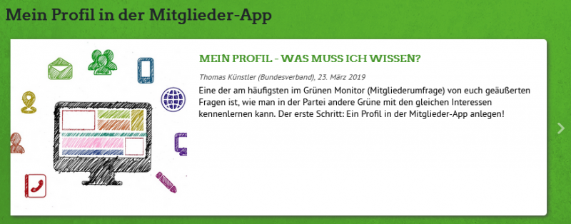 Häufig stellt sich die Frage, wie man im Kreisverband oder auch außerhalb andere Grüne mit den gleichen Interessen kennenlernen kann. Oder es wird ganz konkret eine Person mit bestimmten Kompetenzen wie Videoschnitt oder Moderation gesucht. Die gute Nachricht: Diese Informationen könnt ihr in eurem Profil der Mitglieder-App hinterlegen und gezielt danach suchen! Hier findet ihr eine kurze Bilderstrecke, welche erklärt, wie ihr im grünen Netz euer Profil anlegen könnt: