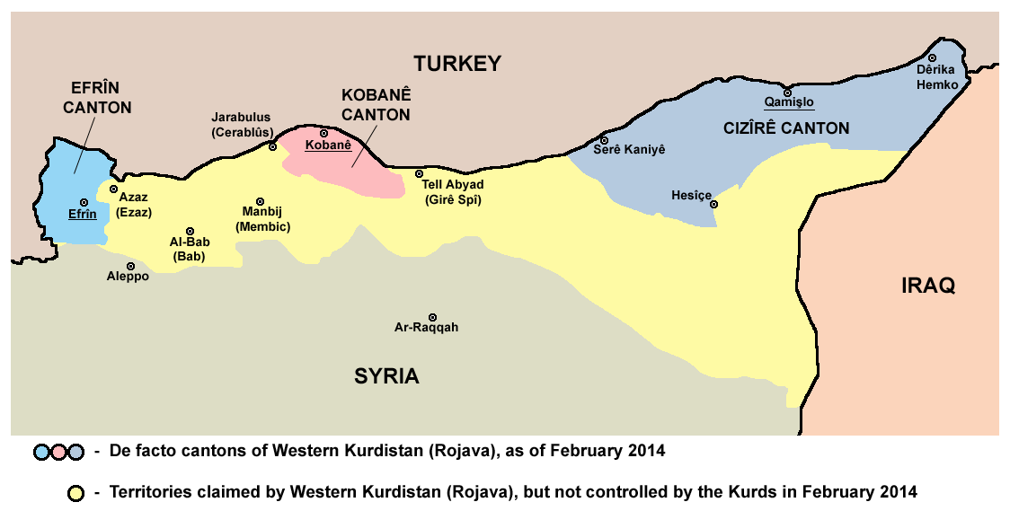 Im Norden des heutigen Syriens, überwiegend kurdisch bewohnte Regionen, an der Grenze der Türkei administrativ gesehen besteht Rojava aus Teilen der syrischen Gouvernements Aleppo, al-Hasaka und ar-Raqqa
